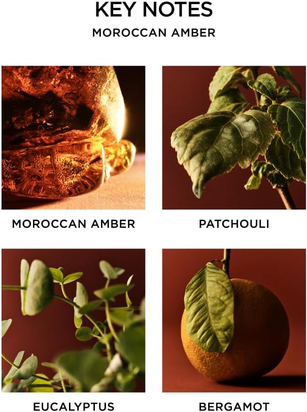 - EARTHY & WOODY - An alluring blend of Moroccan amber, sweet patchouli, heliotrope, and bergamot accented with a hint of eucalyptus that creates an exotic atmosphere.