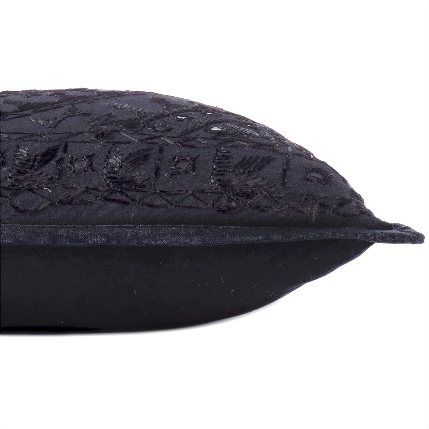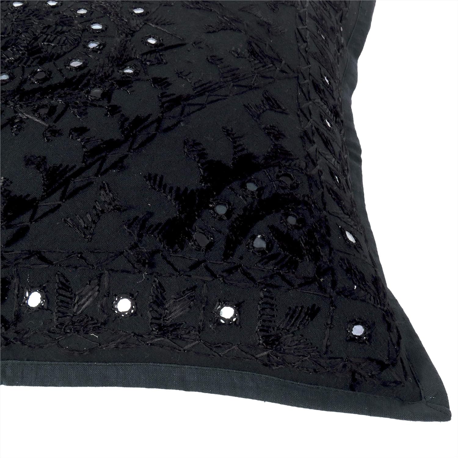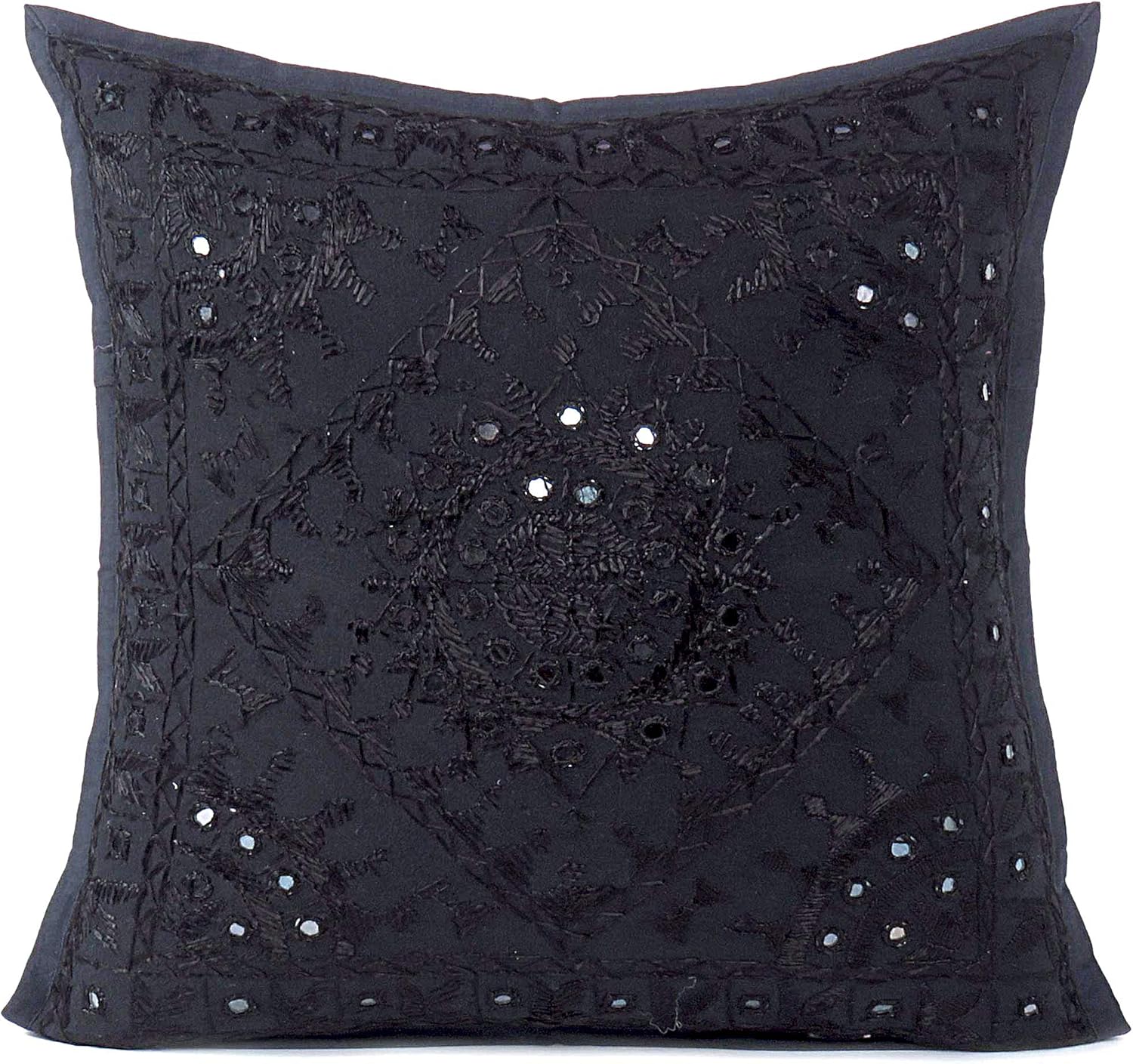 Eyes of India Embroidered Decorative Boho Throw Pillow Cover with Mirrors, Handmade Bohemian Accent Cushion Case for Sofa Couch Bedroom Living Room (Black, 16" x 16")