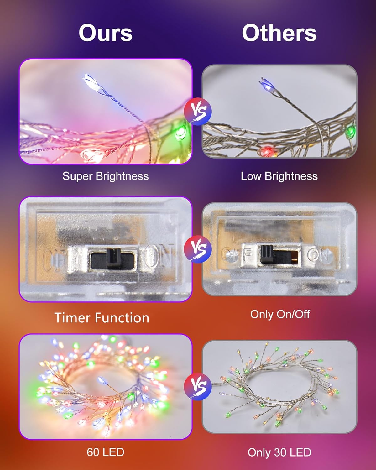 - Brighter Lights: 5 feet 3 x AA battery operated twinkling firecracker cluster lights, the luminous miniature LED light looks like a drop of light attached to a shiny wire, with a steady 360-degree viewing angle they illuminate in every direction