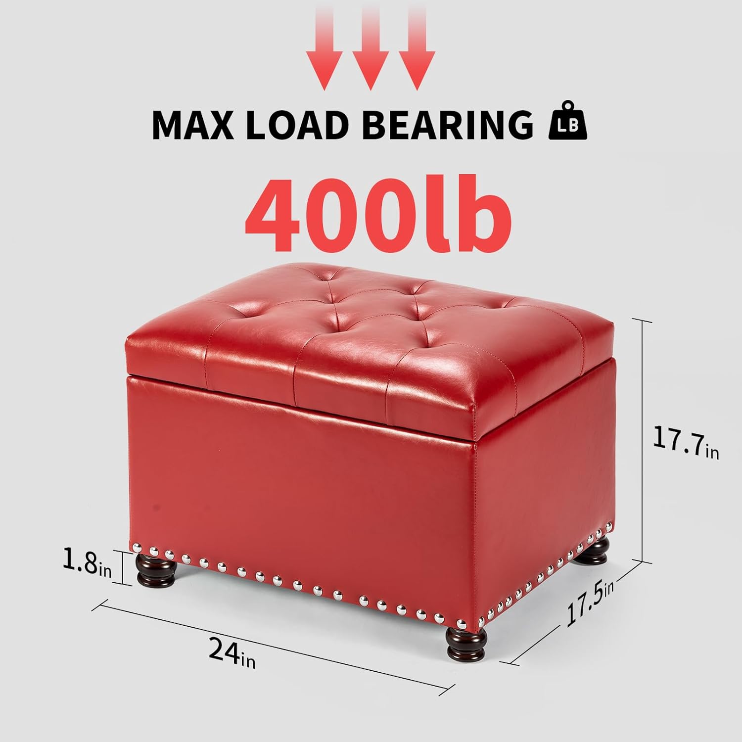 Joveco Leather Storage Ottoman, 24" Rectangle Square Bench Foot Rest Stool for Bedroom Living Room, Red