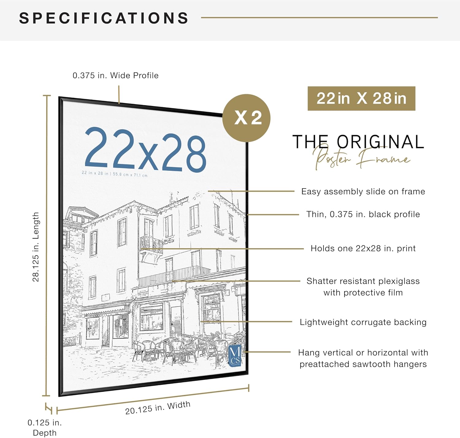 MCS Original Poster Frame 22x28 Black Lightweight Vertical & Horizontal Wall Hanging Large Picture Frame for Posters, Art Prints & Gallery Wall (2-Pack)