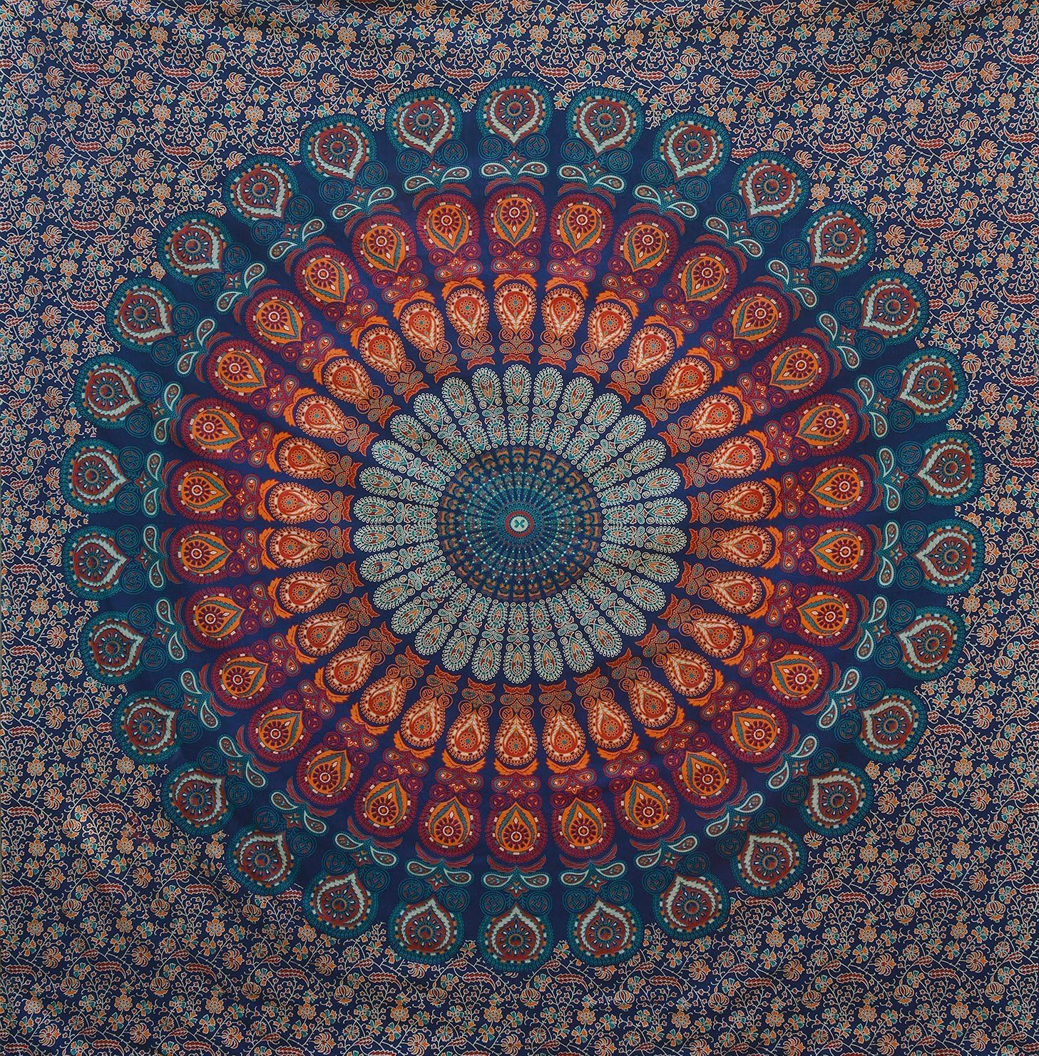 Bless International Handmade Indian hippie Bohemian Psychedelic Peacock Mandala Wall hanging College Dorm Beach Throws Table Cloth Bedding Tapestry (Golden Blue, Queen(84x90Inches)(215x230Cms))