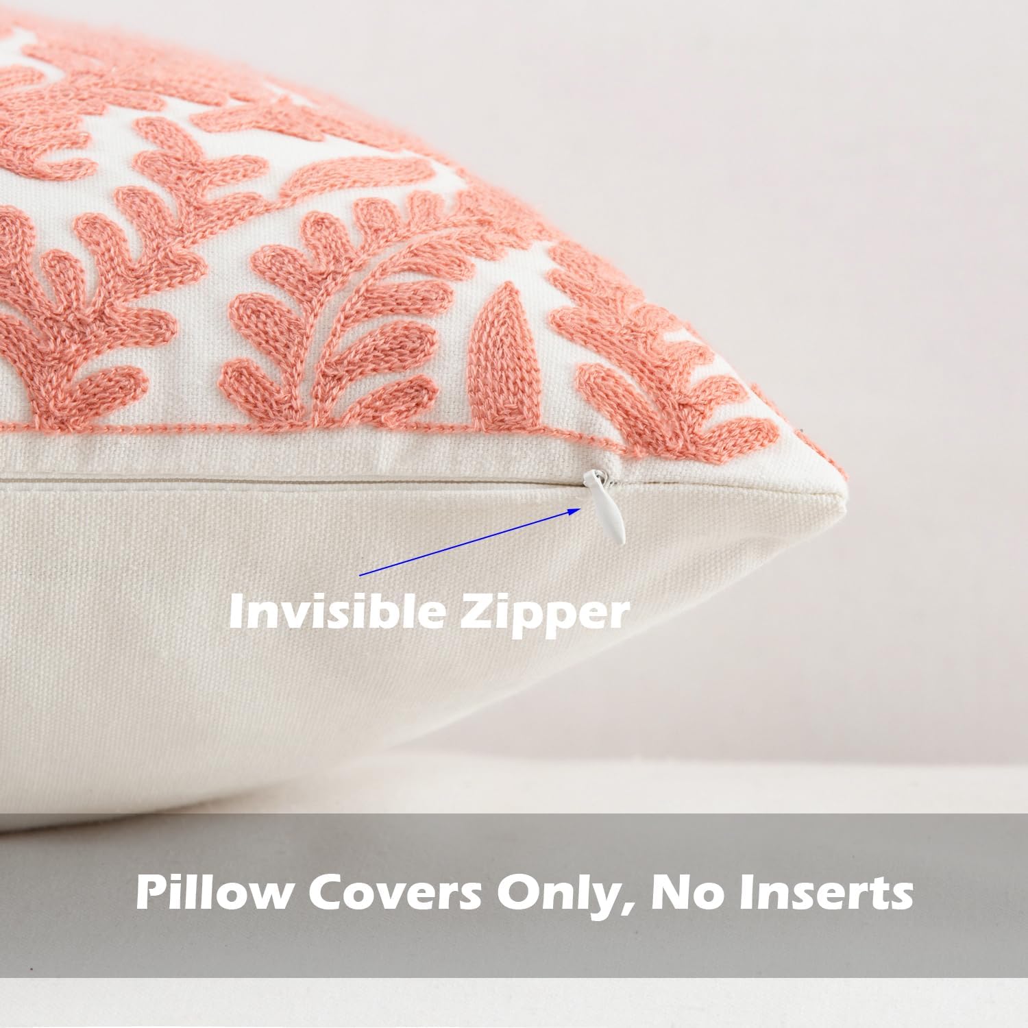HWY 50 Coral Pink Decorative Throw Pillow Covers 18x18 Inch (1 Piece), Embroidered Cotton Farmhouse Cushion Cover Pillow Case for Sofa Couch Living Room Bed Bedroon, Floral Branches