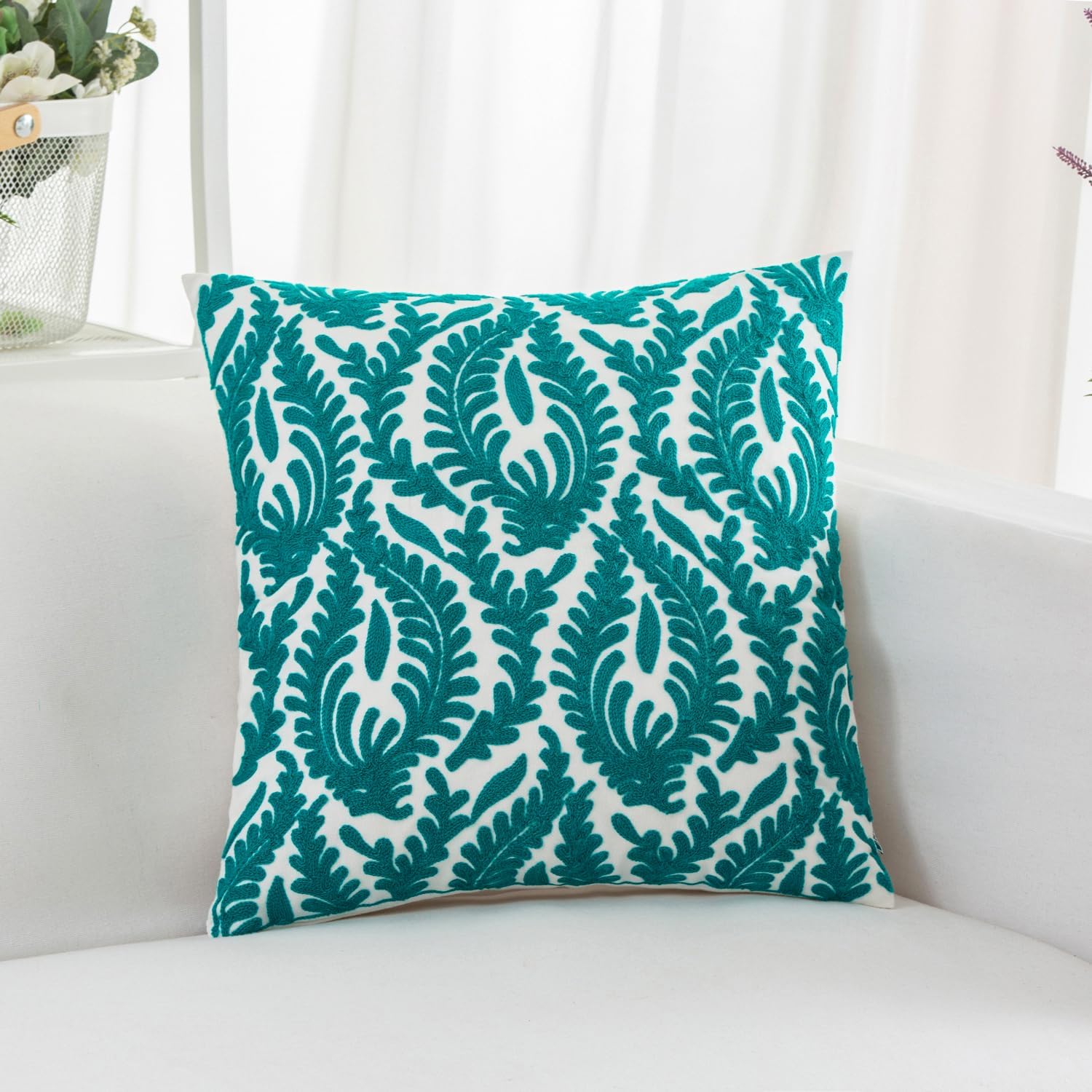 HWY 50 Teal Decorative Throw Pillow Covers 18x18 Inch (1 Piece), Embroidered Cotton Farmhouse Cushion Cover Pillow Case for Sofa Couch Living Room Bed Bedroon, Floral Branches