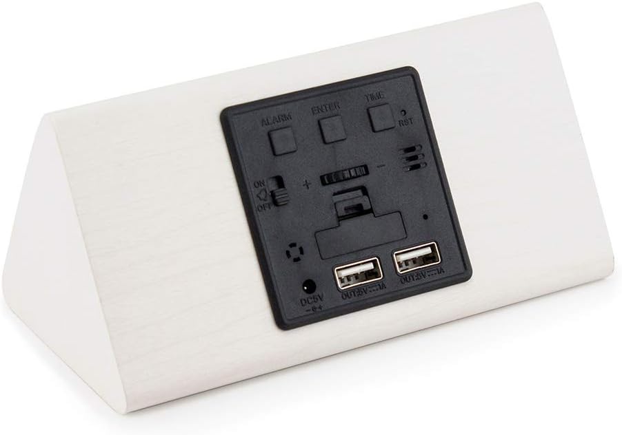- MULTI-FUNCTION: Updated version for 7 levels of brightness adjustable display. Sound control function with acoustic sensor, displays time, date, month, year, temperature (°F), humidity(%RH), and alarm clock functions with LED lights that glows through the marble pattern finish. There are 2 USB output ports on the back (5V, 1A) that allows charging for Android or Apple system smart phones at the same time.
