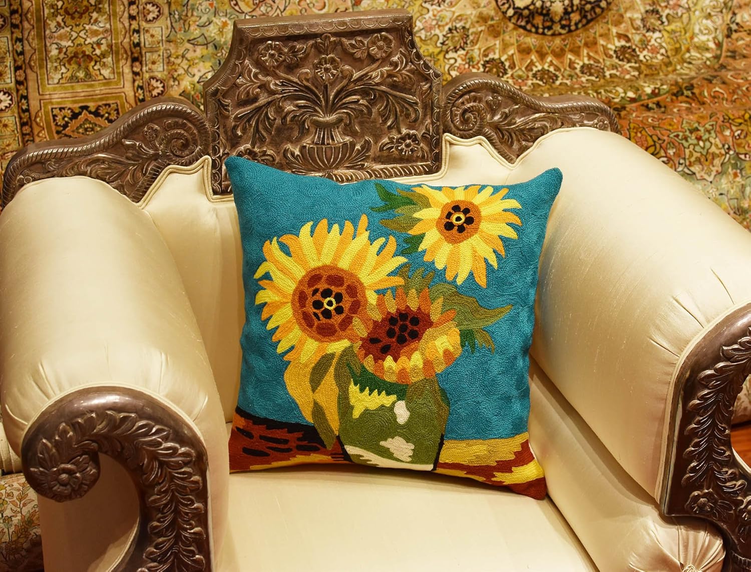 Turquoise Van Gogh Sunflower Pillow Cover Teal Floral Sofa Pillowcase Flower Chair Cushion Accent Throw Flowery Outdoor Pillows Farmhouse Couch Handmade Wool Size 18x18
