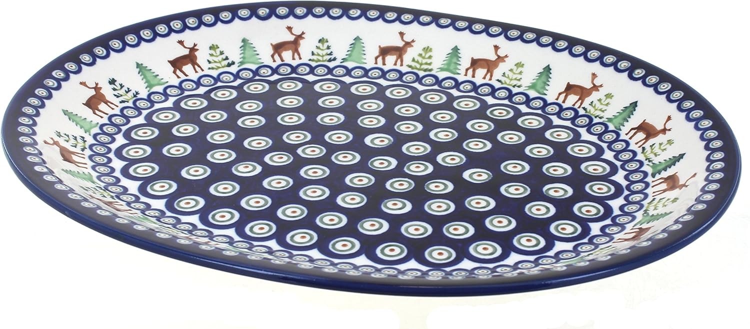 Blue Rose Polish Pottery Reindeer Pine Large Serving Platter