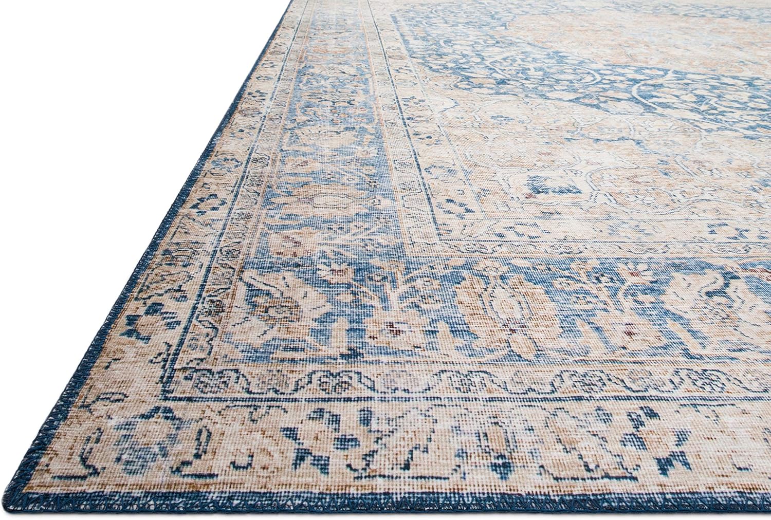 Loloi Layla Collection LAY-07 Blue/Tangerine 2'-6" x 9'-6" .13" Thick Runner Rug, Soft, Durable, Vintage Inspired, Distressed, Low Pile, Non-Shedding, Easy Clean, Printed, Living Room Rug