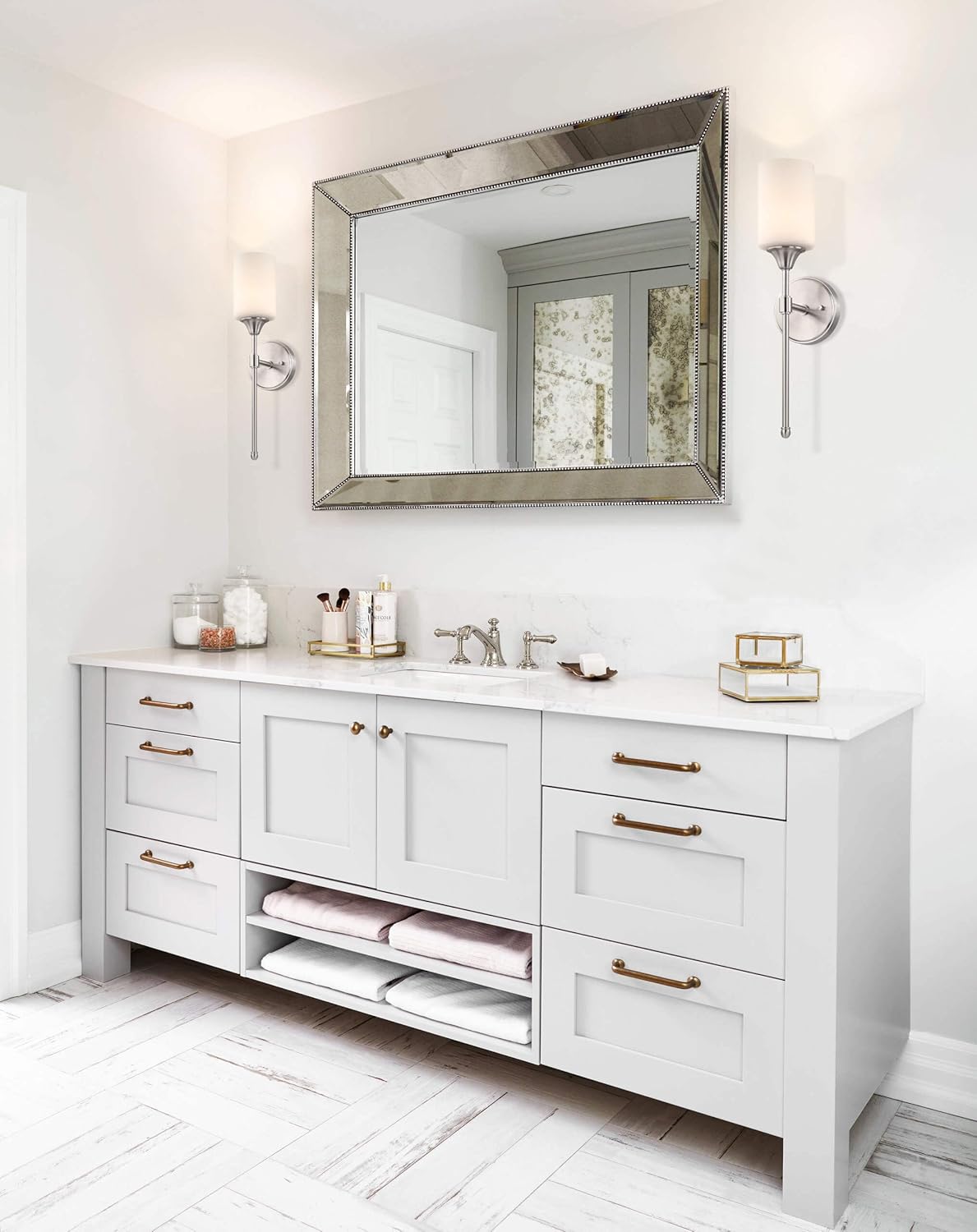 - CLASSIC & TRANSITIONAL DESIGN: Bathroom sonces wall lighting pairs simply harware body with white glass shade illumitated a warm light shine to bathrooms, bedrooms, corridors, entryways, kitchen, restaurant, dinning and living areas
