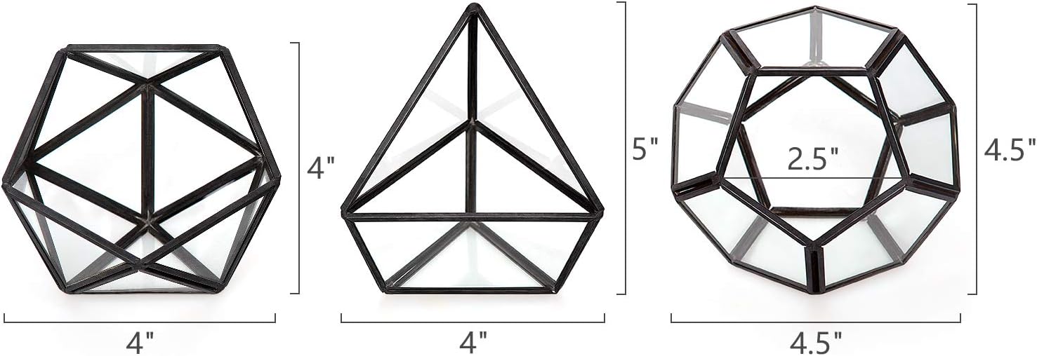 - Size: Pentagon Globe-shaped is 4.5" in diameter, Opening's diameter is 2.5"; Triangle Teadrop-shaped is 4"W×5"H, Opening's diameter is 4"W x 3"H; Pentagon Bowl-shaped is 4"W×4"H, Opening's diameter is 4". The glass geo cases are suitable for small or young plants. Great gift idea for greenary or art lovers!