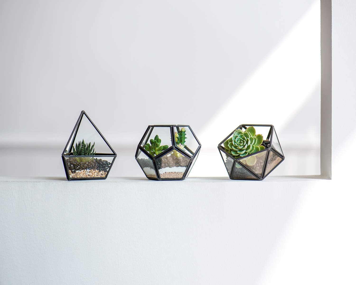 - Simple and elegant appearance designs in 3 different shapes of Globe, Triangle Teardrop and Bowl adds modern and stylish sense to your living surroundings or work space. Beautiful artistic polyhedron terrarium for holding plants like succulent, fern, moss, cacti, tillandsias, air plants, DIY mini fairy garden, artificial plants with easy maintainence or other decorative objects.