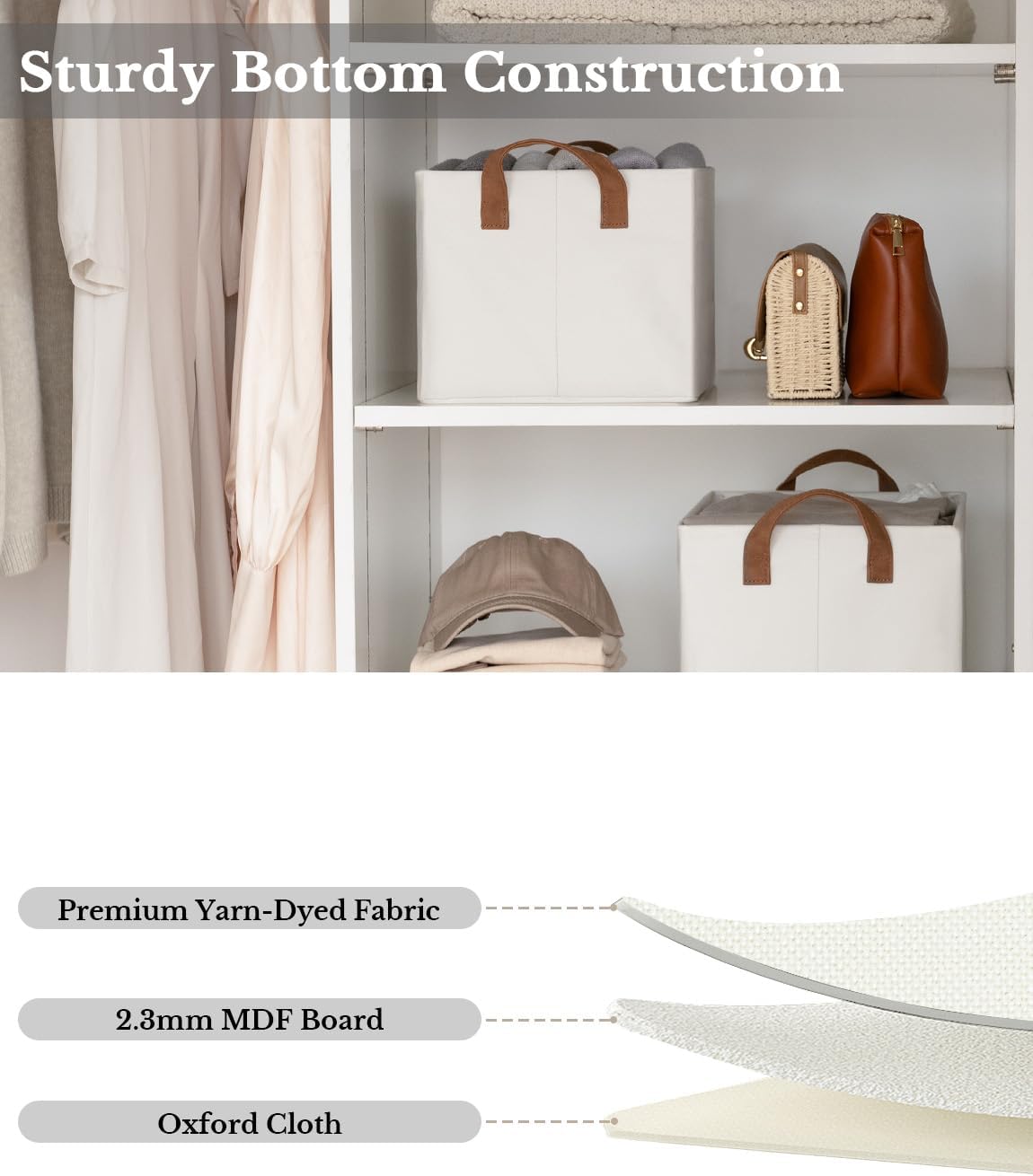 - Premium Quality: Made from high-quality fabric and reinforced with a heavy-duty MDF bottom board and a sturdy metal frame. The solid construction enables the storage bins to stand upright without support, even when empty.