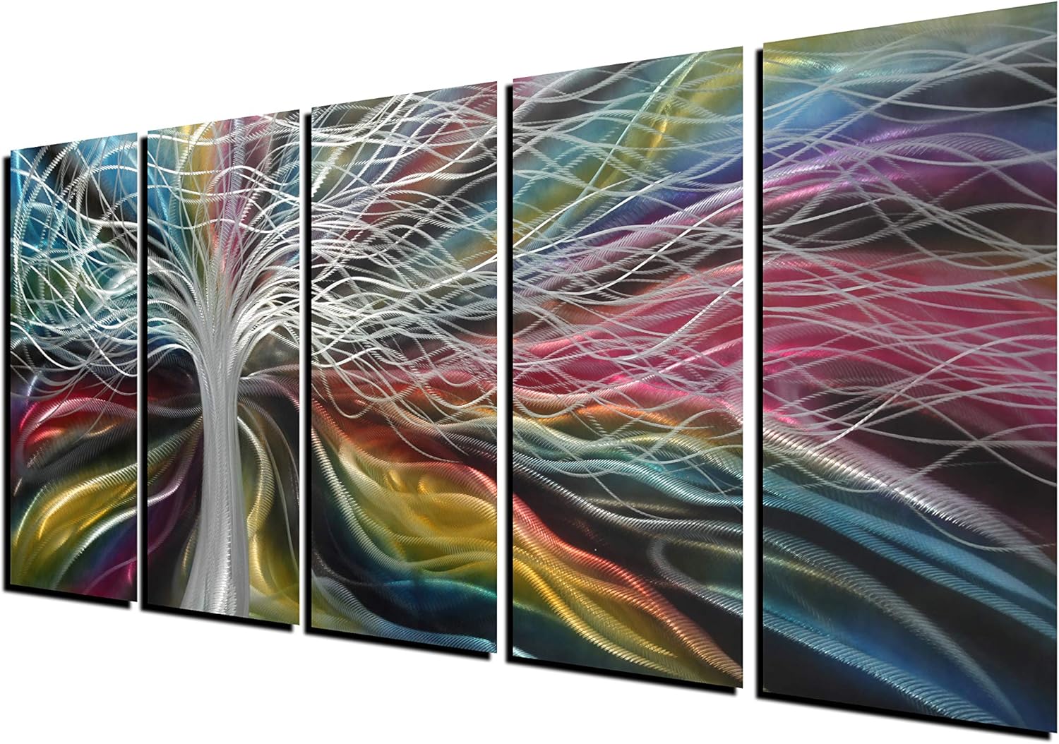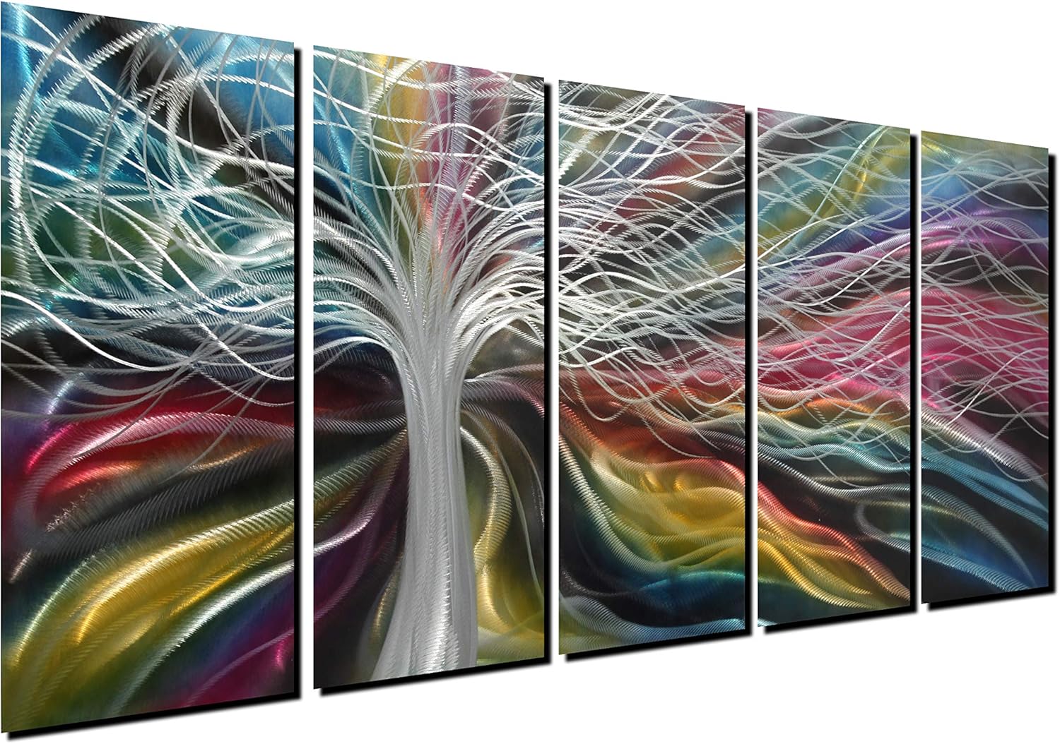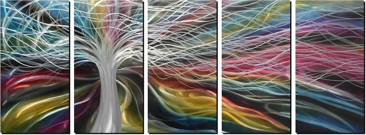 Unique Metal Wall Art with Colorful Fantastic Tree Design, Abstract Modern and Contemporary Décor, Metal Wall Sculpture, Silver Aluminum Artwork, Indoor and Outdoor decoration, 5 panels 64"x24"