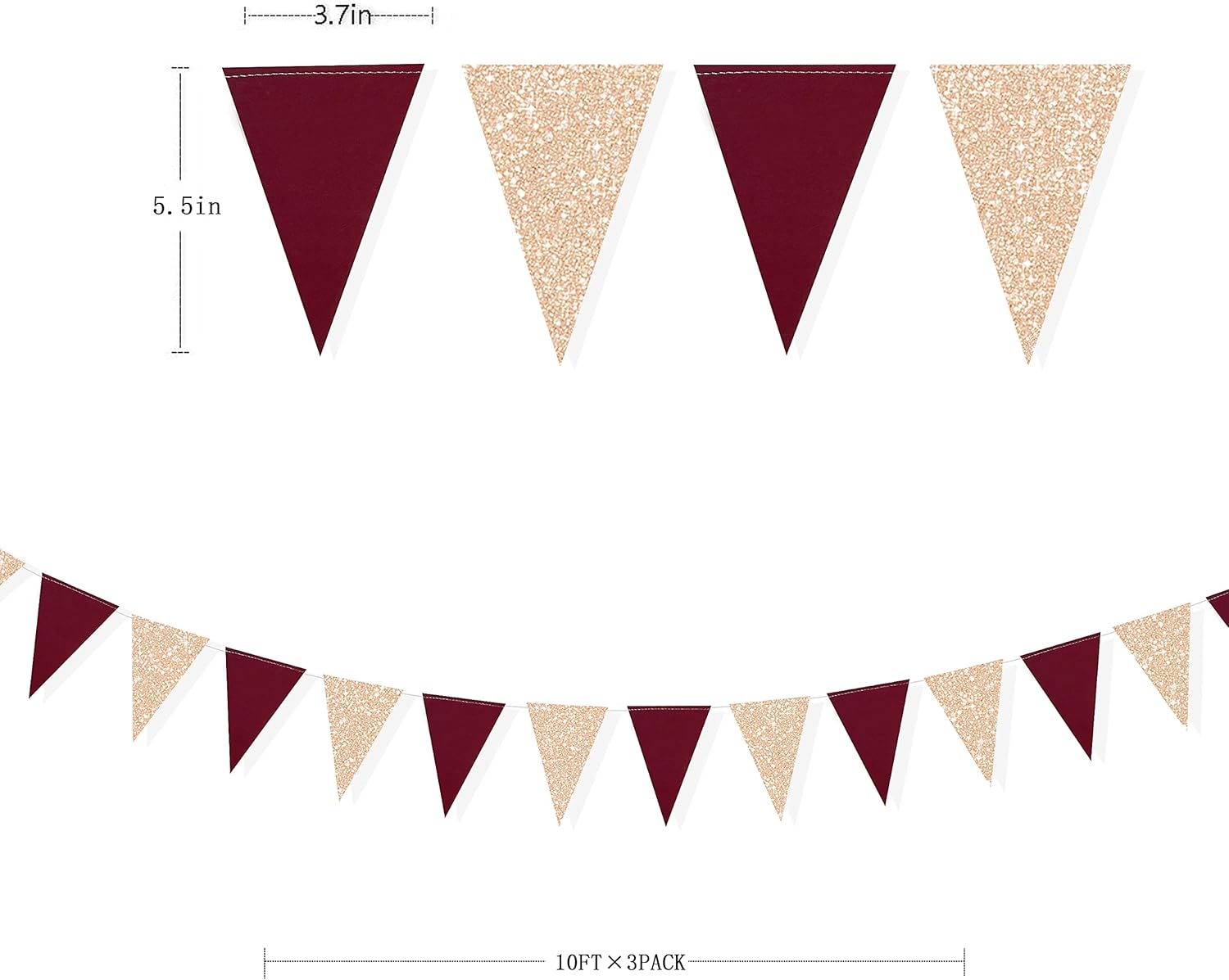 - Package Include - 3 set of double sided glitter champagne gold burgundy decorations hanging banner kit.each string is 3 meters with 26 pieces triangular flags,so total is 9 meters = 30 feet and 78 pieces flags. Size of each flag:14cm x 9cm/5.5" x 3.7" (L x W).
