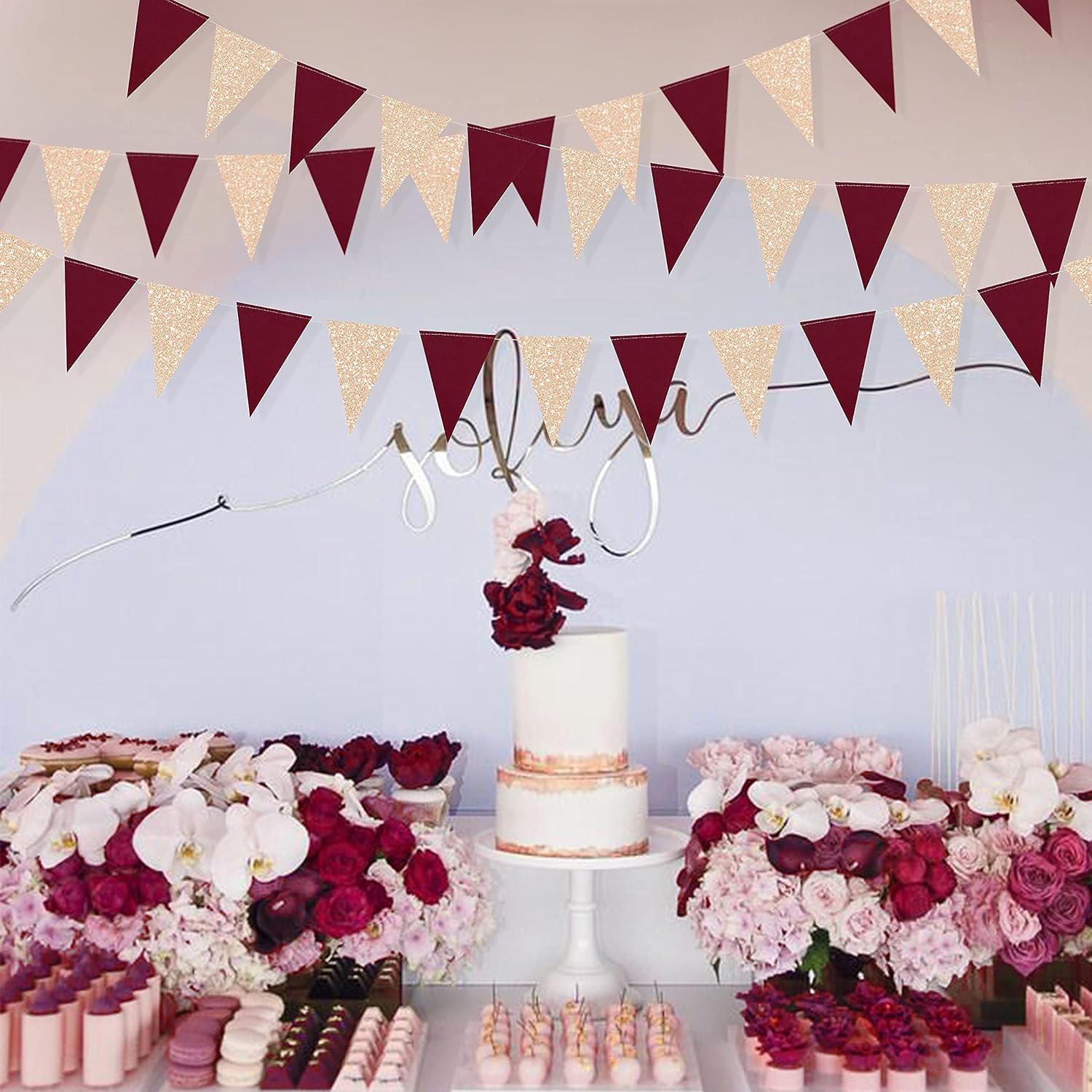 - Special Design - Our red wine triangle flag banners are made of two environmental materials paper alternately.Double sided frosted burgundy paper and glitter champagne gold paper with neat cut,carefully hand-made and machine-sewn together with thread.durable and reusable.