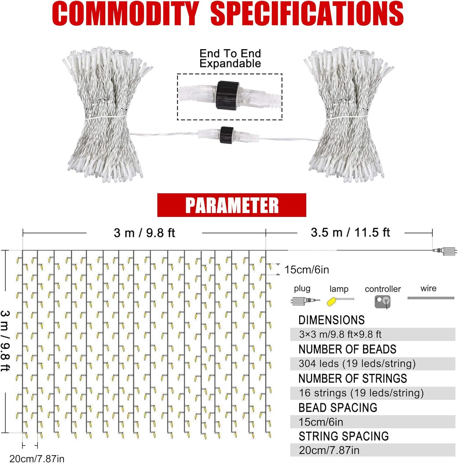 - Length description:9.8ft*9.8ft,with 304LED twinkle bulbs; spacing between every LED: 15cm/6in;It can meanwhile connect of 5 curtain lights;and the12ft lead wire length is enough for you to decorate the place where you want.