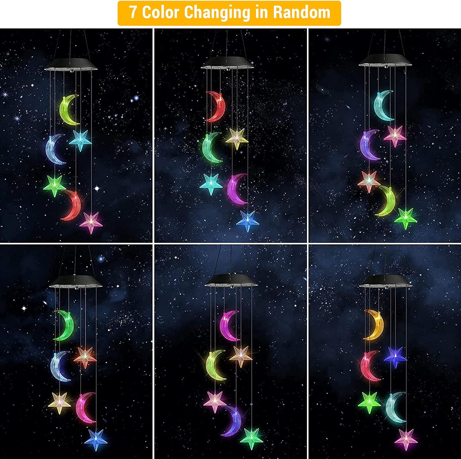 - 🌙【7 Colors Changing Decorative Mobile Lights】 The solar Moon and Star decorative lights change color alternatively between red, green, orange, blue, yellow, purple and white, one color gradually transitions into another creating a surreal visual effect, adds a charming display of lights and make your surroundings look dreamy and magical. This solar wind chimes will definitely suitable for your bedroom, patio, balcony, window or garden decoration.