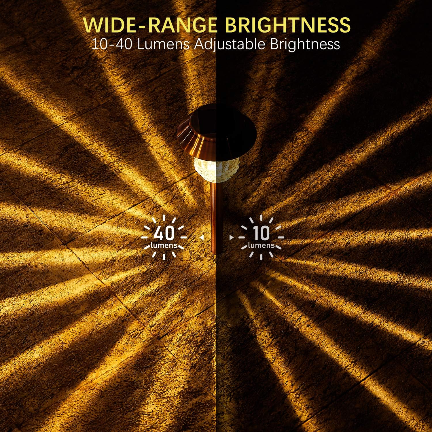 - Customize Modes & Long Lasting: Solar garden lights outdoor with optional modes to choose from 10 - 40 LM. Low Mode: 10 LM brightness is perfect for winter lasting up to 10 H. High Mode: 40 LM brightness is perfect for summer lasting up to 5 - 6 H.