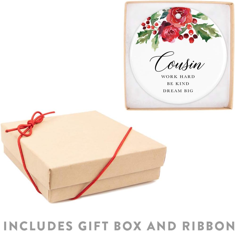 Andaz Press Round Ceramic Porcelain Christmas Tree Ornament Keepsake Gift for Cousins, Cousin Work Hard Be Kind Dream Big, 1-Pack, Includes Ribbon and Gift Box