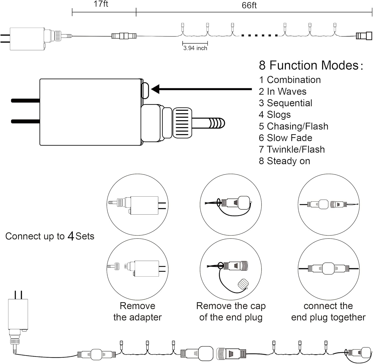 - 8 Lighting Functions: Our Halloween string lights have 8 lighting modes: combination, in waves, sequential, slogs, chasing/flash, slow fade, twinkle/flash, and steady on. Fit different occasions, moods, feelings, holidays, festivals, anniversaries, etc. Pressing the round button on the transformer to change the lighting modes.