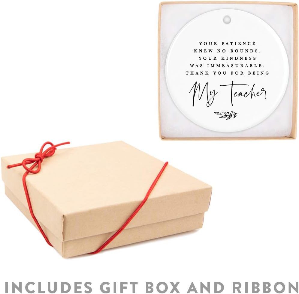 Andaz Press Round Ceramic Porcelain Christmas Tree Ornament for Teacher Thank You Appreciation Graduation Gift, Your Patience Knew No Bounds. Thank You for Being My Teacher, 1-Pack