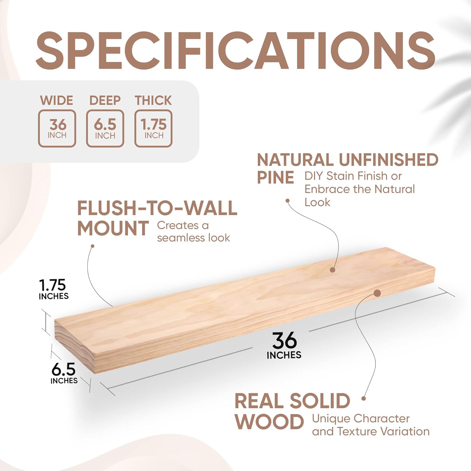 - AUTHENTIC WOOD GRAIN - Enjoy the timeless elegance of real wood. Handcrafted from the finest 1.75" Thick natural pine wood measuring 36" Wide x 6.5" Deep x 1.75". Our shelves highlight the inherent charm and durability of high-quality wood. Each Shelf reveals its unique character of knots and natural wood grain; each ledge is a little different but equally stunning.