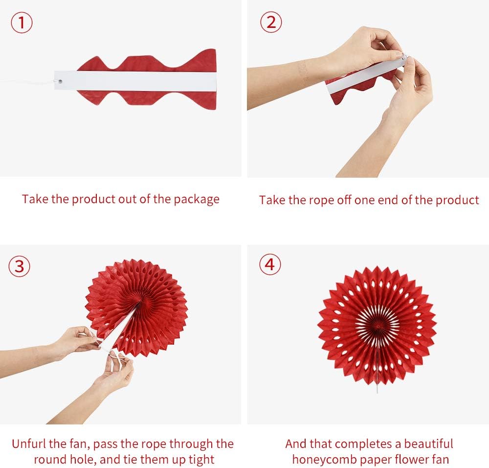 - Easy to assemble and uniquely designed:These hanging paper fans have a hanging string attached,just unfold the paper flower fan and fix it with the rope of the paper flower fan, then you can hang it to your favorite place and decorate your party perfectly in a few minutes.