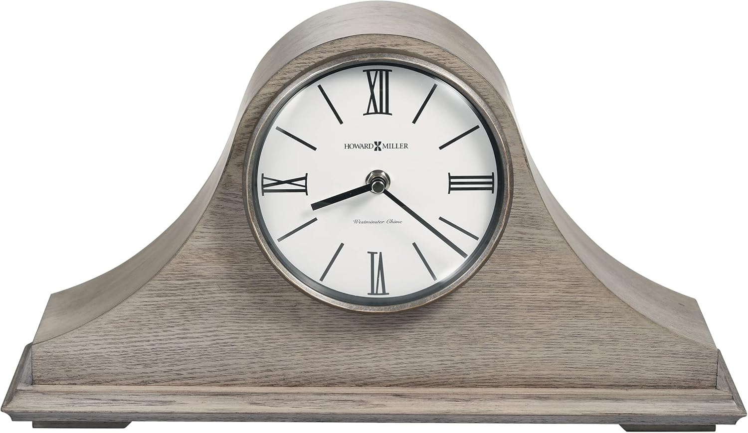 - TIMELESS STYLE: This Howard Miller wooden mantel clock exemplifies refined craftsmanship with its elegant tambour-style design and Gray finish. Its neutral tone blends effortlessly into modern or transitional interiors, offering a touch of warmth and sophistication. The clean lines, complemented by a crisp white dial and Roman numerals, make this timepiece a charming yet understated addition to any mantel or shelf.