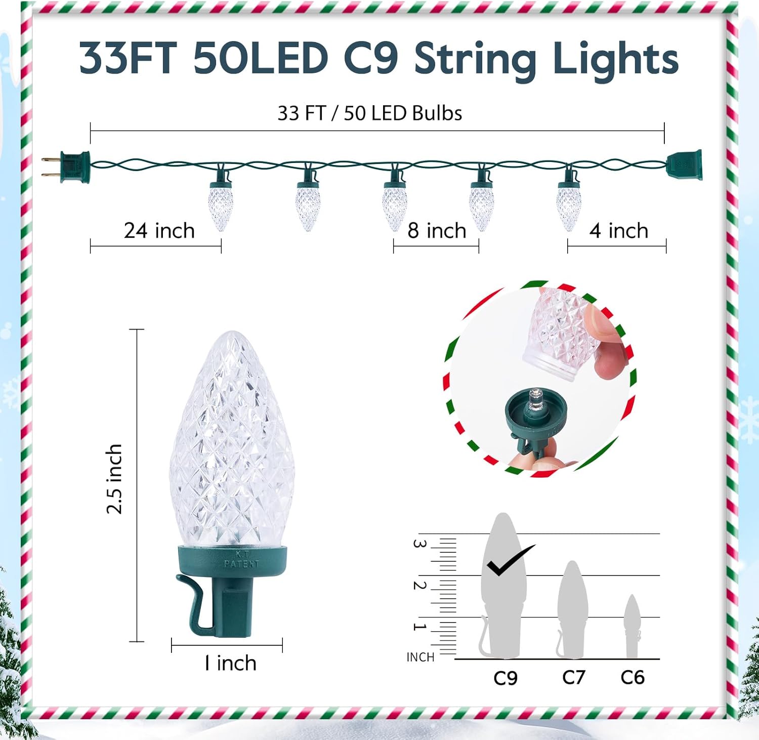 Brightown C9 LED Christmas String Lights, 33ft 50 LED Waterproof Strawberry String Lights, Plug-in Extendable Green Wire Lights String for Outdoor Indoor Patio Party Decoration, (Warm White)