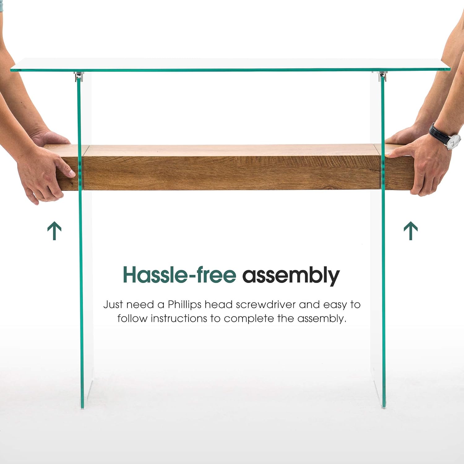 - Modern Air Console Table: Crafted with tempered glass supports and faux wood, this small entryway table creates a mesmerizing floating illusion that visually expands small spaces. The transparent base enhances natural light flow, brightening tight entryways or narrow hallways