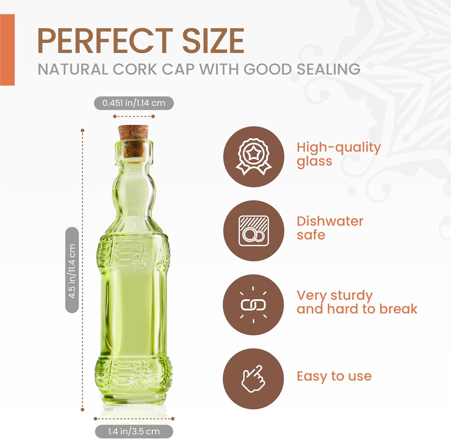 Small Mini Green Vintage Glass Bottles with Corks, Mini Vases, Decorative, Potion, Assorted Design Set of 12 pcs, 4.6 Inch Tall (11.43cm), 1.4 Inch Wide (3.56cm)