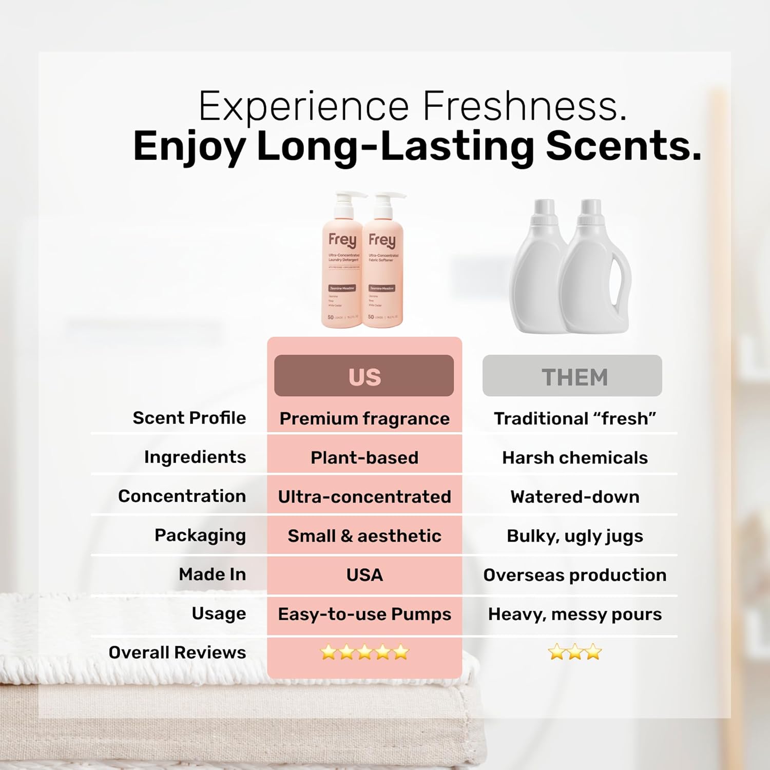 - LONG LASTING DETERGENT THAT'S SAFE FOR YOU - FREY's powerful concentrated laundry detergent liquid is formulated to last a long time and is also made without harsh ingredients, making it safe for you and your clothes. The perfect pairing to our fabric softener, the FREY detergent includes ingredients like Cedarwood, Oakmoss and Amber and is HE compatible.