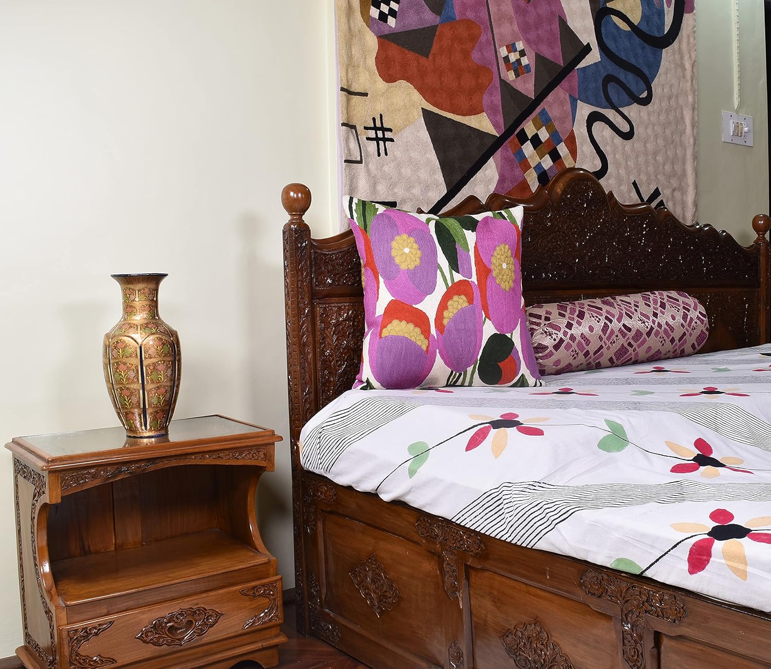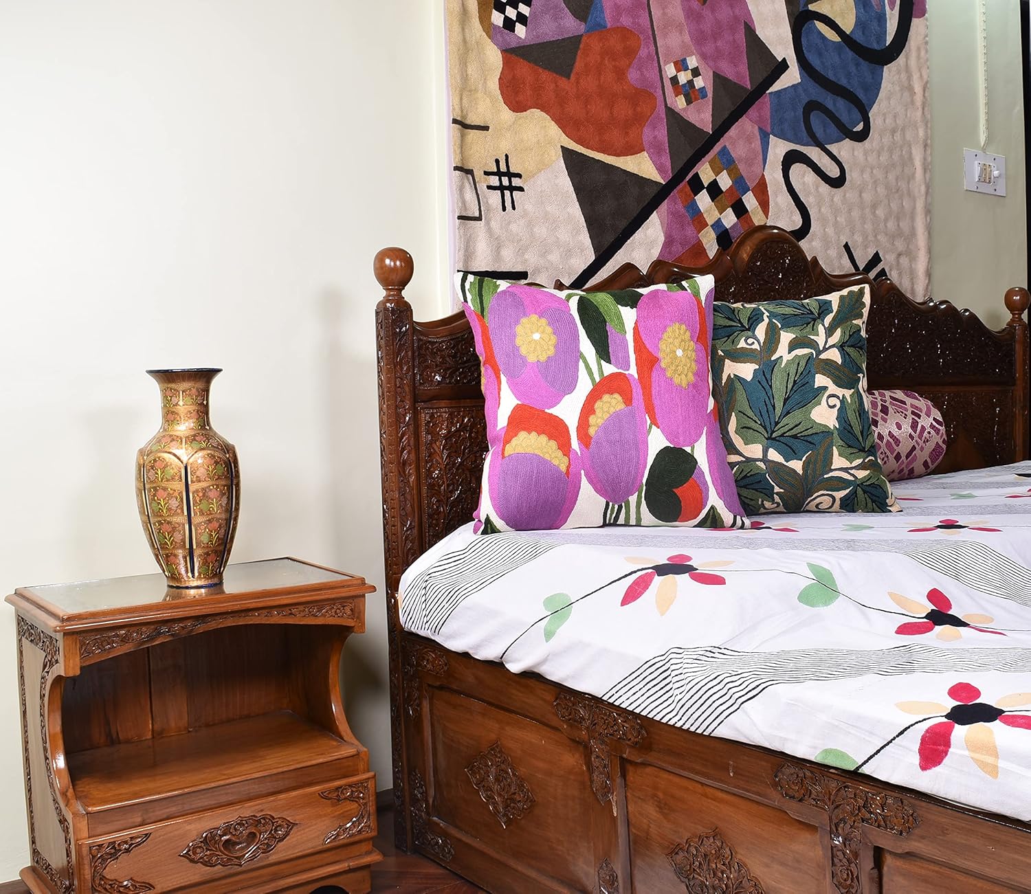 - π FLORAL THROW PILLOW COVER - HAND EMBROIDERED: These colorful flower pillows are inspired from contemporary modern floral art designs and are hand embroidered in soft wool to perfection, stitch by stitch, by the finest artisans, creating an extraordinary all modern floral design pillow for your home decor. A close-up view of this all modern flower cushions allows you to see the amazing fine chain-stitch hand embroidery that covers the whole front side of this floral pillowcase.