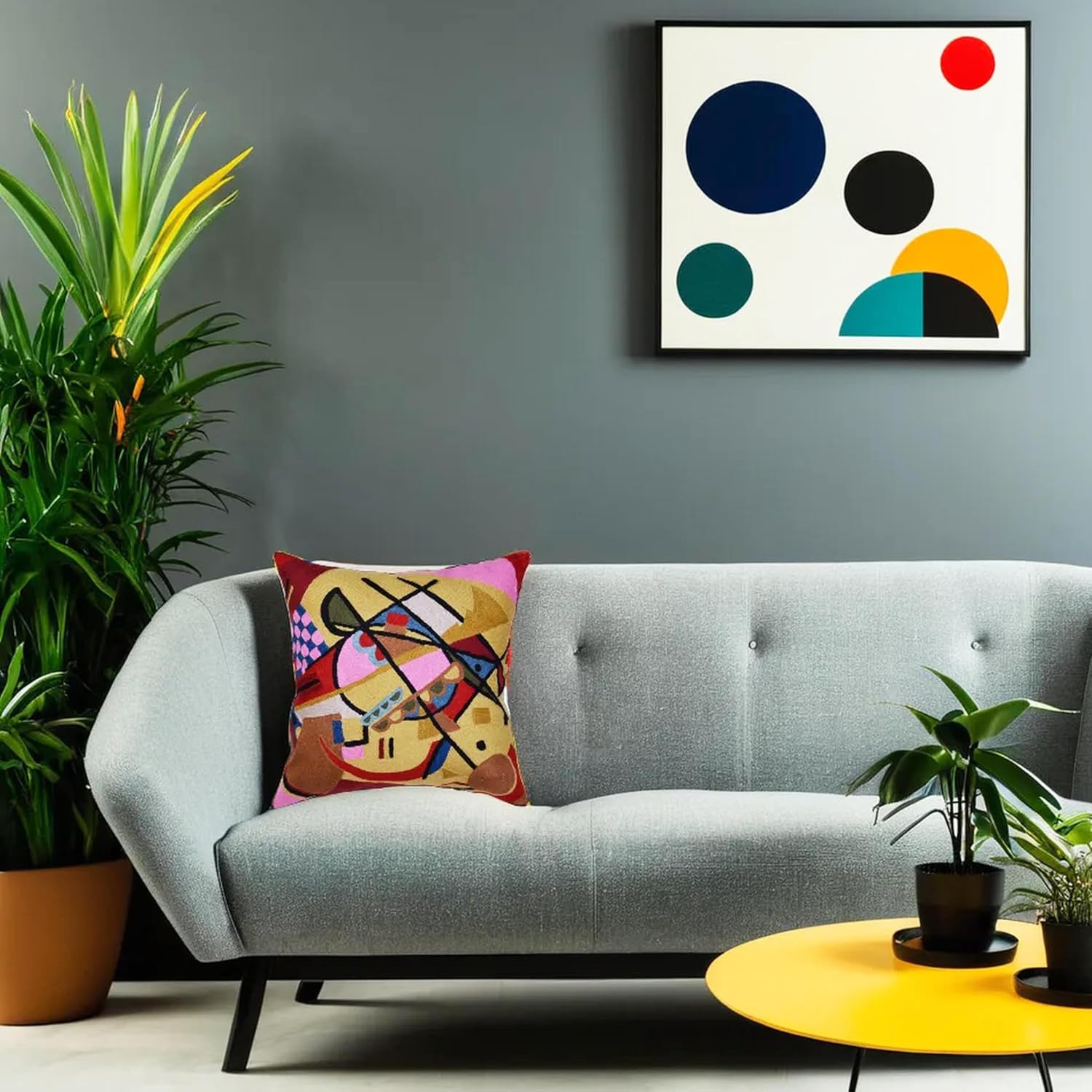 - π MODERN THROW PILLOW COVER - HAND EMBROIDERED: These colorful decorative modern throw pillow covers are inspired by the art of Kandinsky and are hand embroidered in soft wool to perfection, stitch by stitch, by the finest artisans, creating an extraordinary all modern abstract pillow for your home decor. A close-up view of this all modern accent pillow cover allows you to see the amazing fine chain-stitch hand embroidery. A perfect modern sofa pillow for your contemporary couch.
