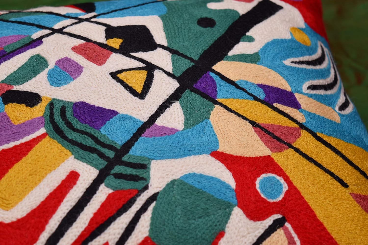 - π MODERN THROW PILLOW COVER - HAND EMBROIDERED: These colorful decorative modern throw pillow covers are inspired by the art of Kandinsky and are hand embroidered in soft wool to perfection, stitch by stitch, by the finest artisans, creating an extraordinary all modern abstract pillow for your home decor. A close-up view of this all modern accent pillow cover allows you to see the amazing fine chain-stitch hand embroidery. A perfect modern sofa pillow for your contemporary couch.