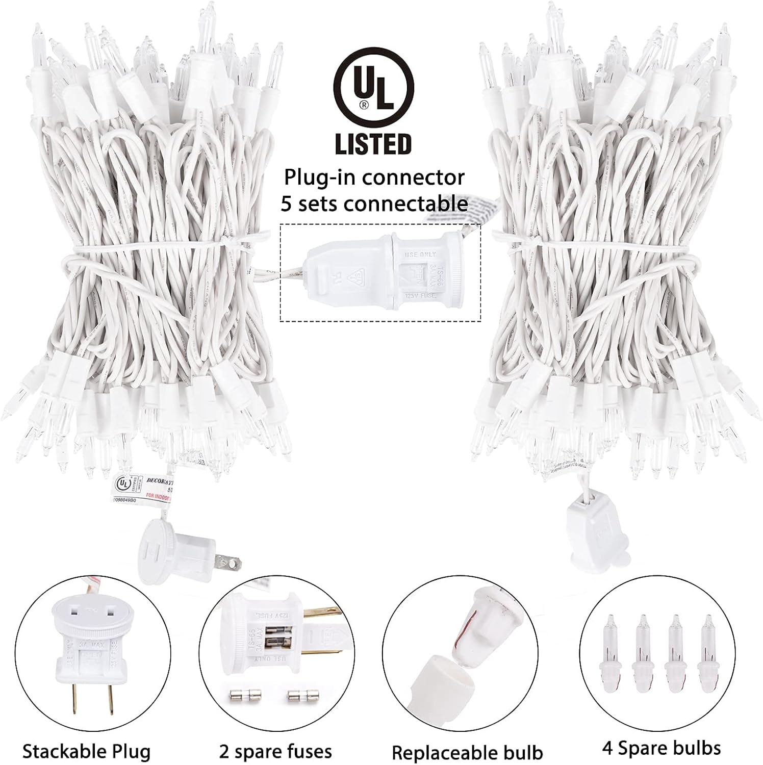 - Easy to Install: The Christmas light sets come with 2 spare fuse and 4 spare bulbs for easy replacement. This mini Christmas light can be connected end-to-end and can be extended to a longer connection length, making it be suitable for different decoration needs. It can be easily installed without additional tools