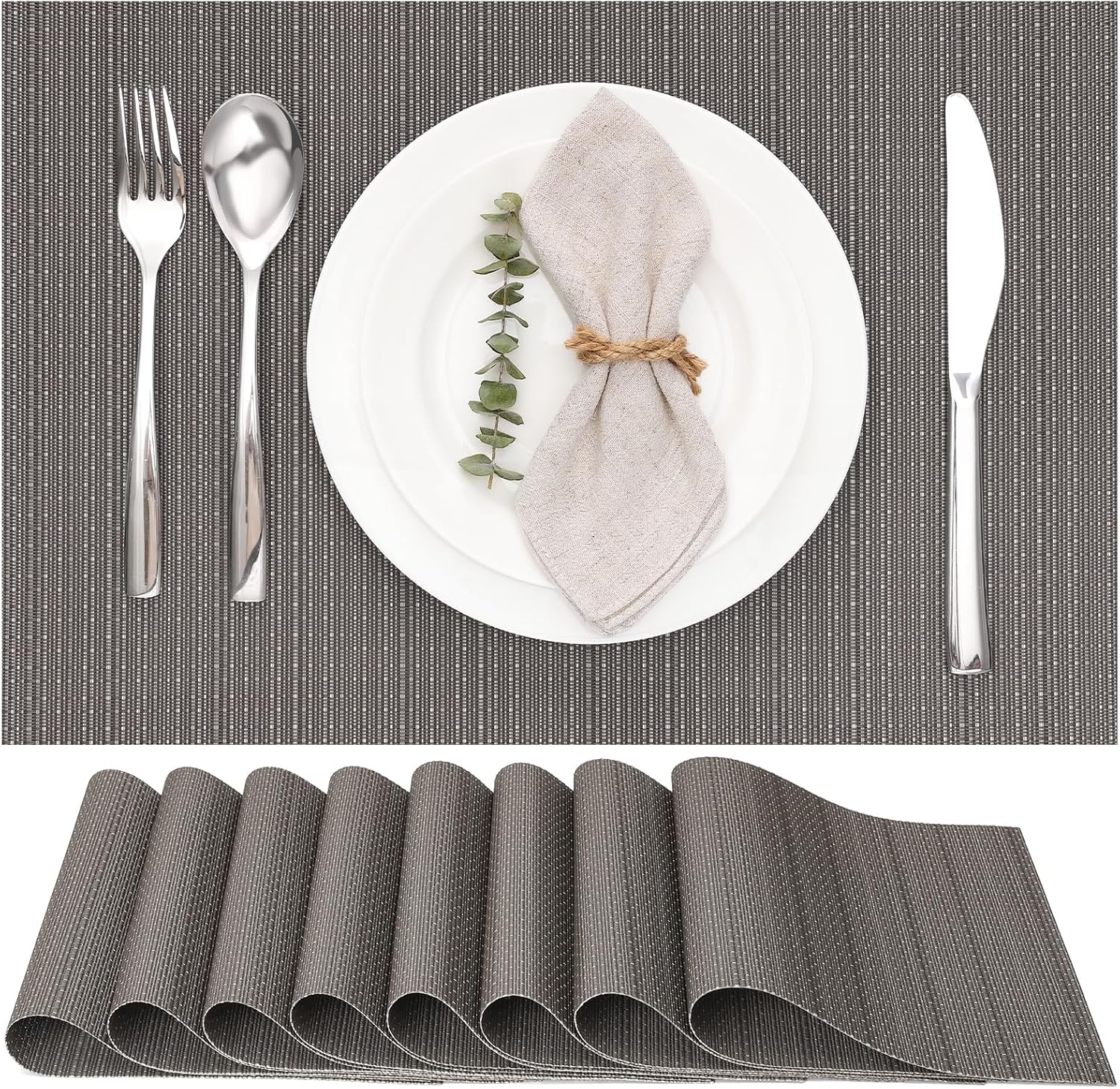 Myir JUN Placemats Set of 8, Vinyl Woven Placemats Place Mats Indoor Set of 8 Washable Table Mats Non-Slip Place mats for Dining Table (Dark Gray, Set of 8)