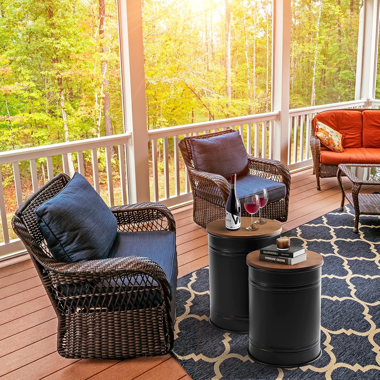 Rustic Storage Ottoman Seat Stool, Farmhouse Accent Side Table, Antique Galvanized Metal End Table Box Bin with Round Wooden Lid Set of 2 (Black)