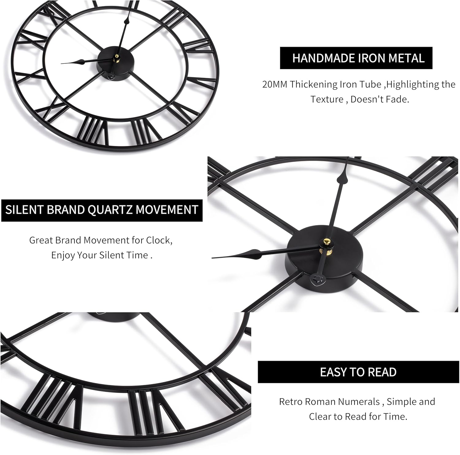 - [Modern Black Clock] The large metal clock has a hollowed-out retro design. The strength and retro appearance of the Roman wall clock are ensured by the use of high-quality materials in the handcrafted, solid iron frame.
