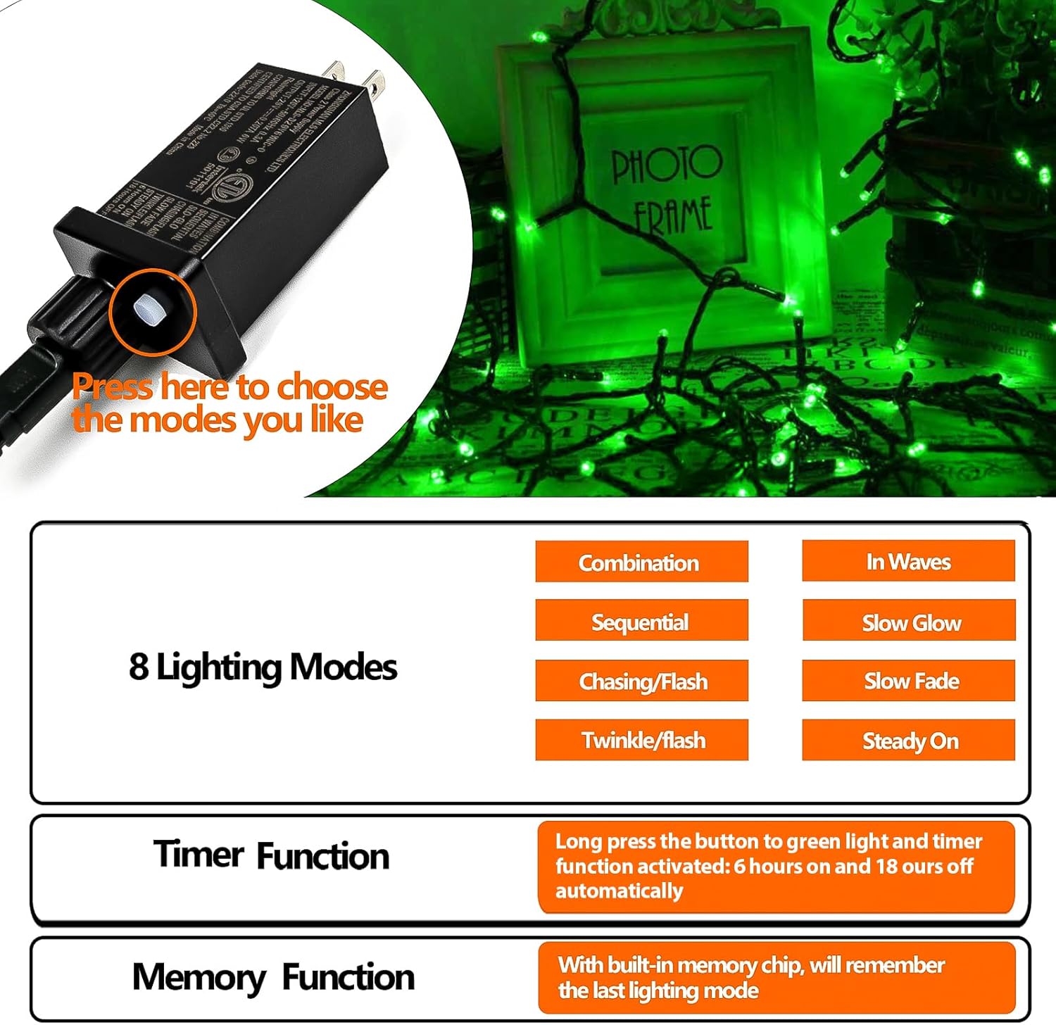 - Memory Function & Timer Options:The green christmas lights is Built-in 4 kinds of timer(4H: 4 hours ON, 20 hours OFF ; 6H: 6 hours ON, 18 hours OFF; 8H: 8 hours ON, 24 hours OFF). And remember the last pattern with the memory function,