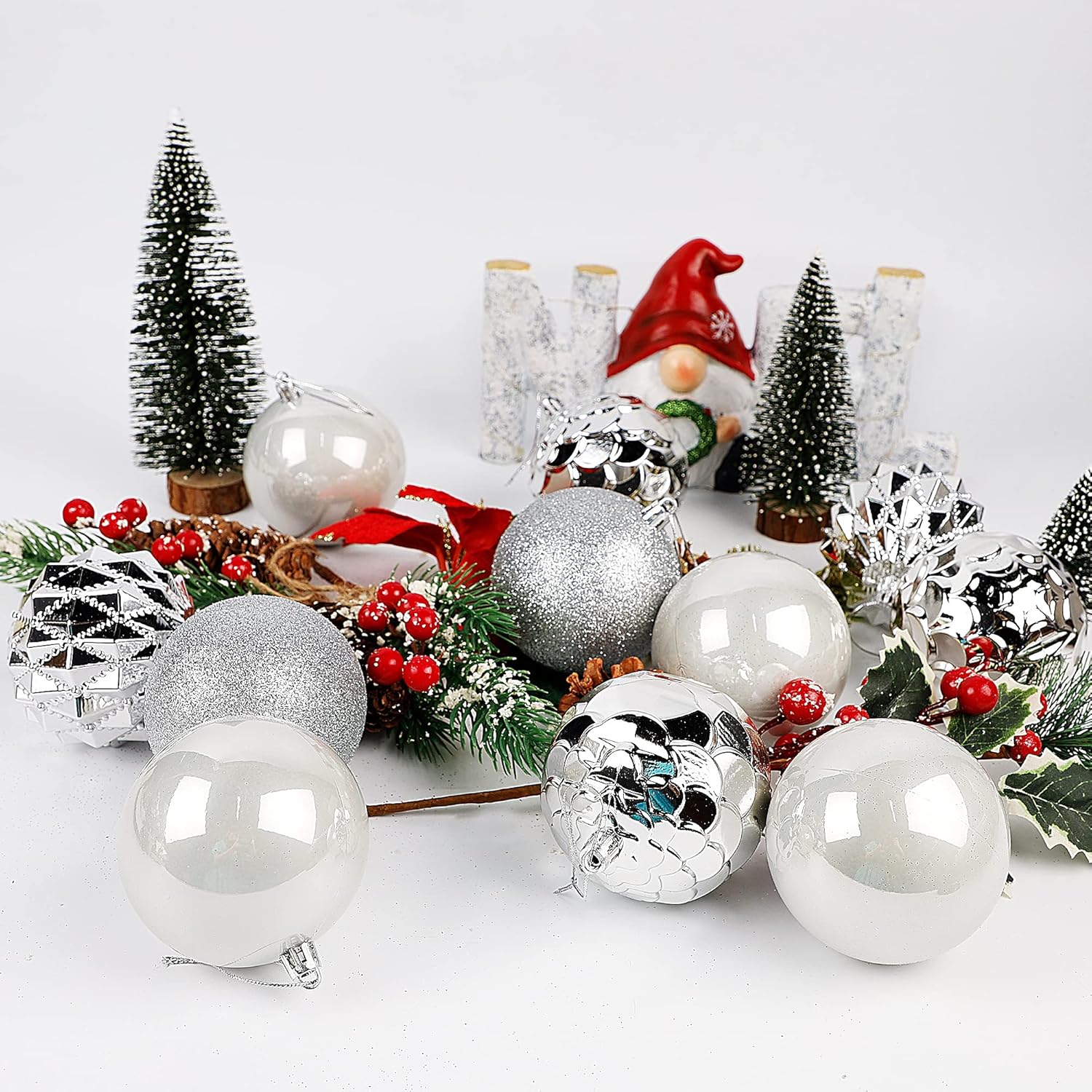 - CHRISTMAS BALLS ASSORTMENT: Sized 3.15" in diameter, Lulu Home silver hanging balls are designed in 4 awesome surfaces β glittered, pineal, polyhedral and unique glass-looking balls. One package includes 20 balls in total, packed in a plastic container.