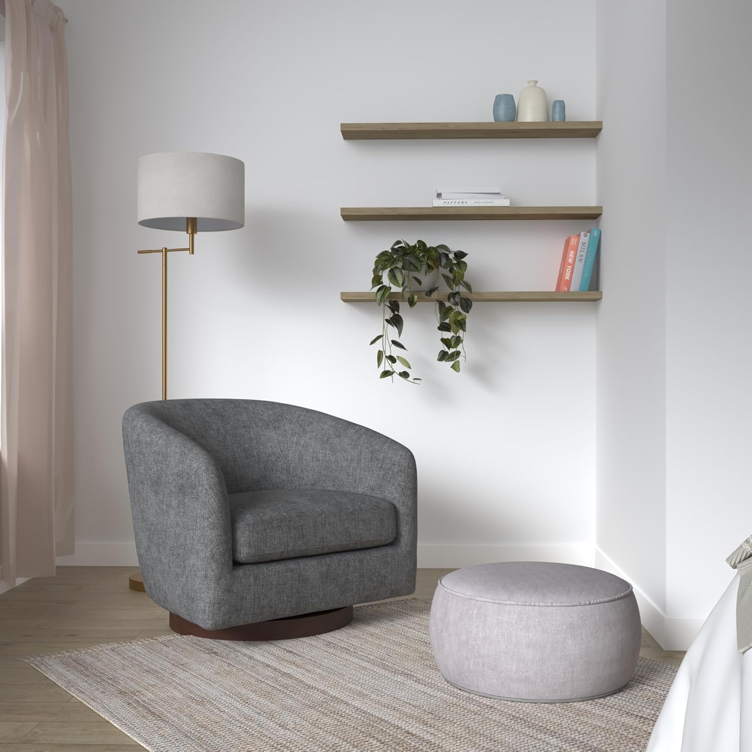 - 360-Degree Swivel - Designed with a sturdy swivel base and refined wood accent details, this chair allows for smooth and effortless rotation.