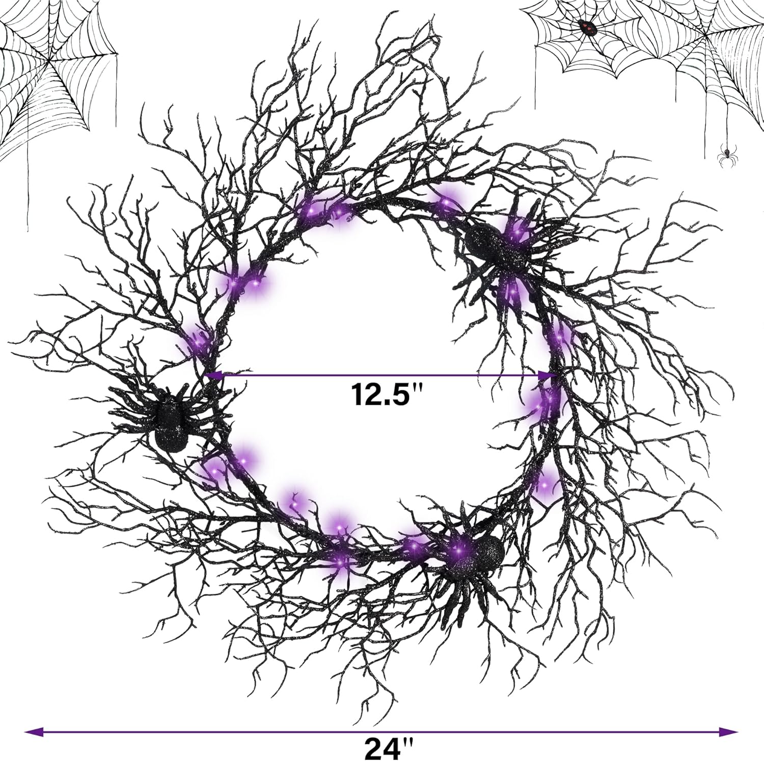 24 Inch Halloween Wreath for Front Door - Lighted Black Spider Wreath with Purple LED Lights, Outdoor/Indoor Spooky Decorations for Halloween Party, Porch, Holiday Home Decor