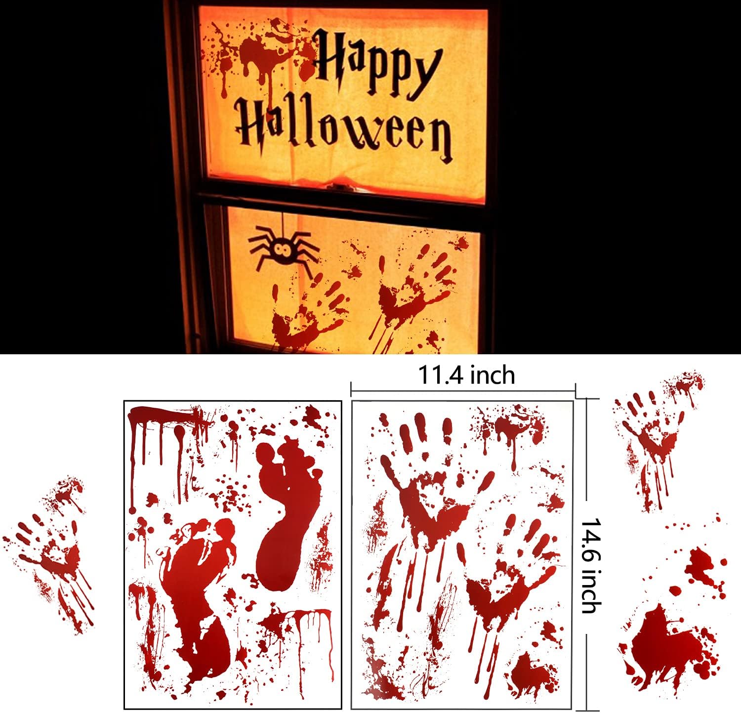- 1. Packaging: You will receive 8 window stickers with a lot of blood stains-4 bloody handprints, 4 bloody footprints and 8 Halloween wound tattoos (approximately 159 stickers).