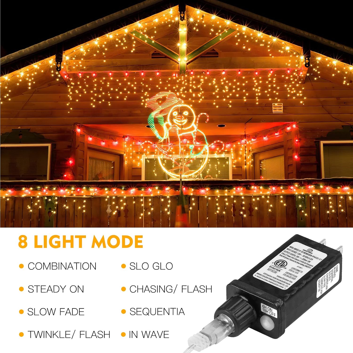 - 【8 Lighting Modes】 Icicle string lights with 8 different light patterns: Combination, In waves, Sequential, Slo-Glo, Chasing/Flash, Slow fade, Twinkle/Flash and Steady on(Tips: Slow fade is a pattern of alternating half-bright and half-off. If you receive the goods and find that half of the lights are not on, it is not a defective product, just switch to other modes).
