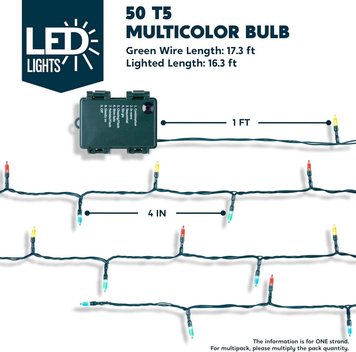 - SUPER VALUE.This Christmas lights set includes 2 packs of battery powered string light. Each set has 50 counts of Multicolor LED bulbs. Each set has 17.3 feet wire length and 16.3 ft lighted length.with 4 inch light spacing. The bulbs interval is at 4 inches and its individual size is 3mm*16mm.
