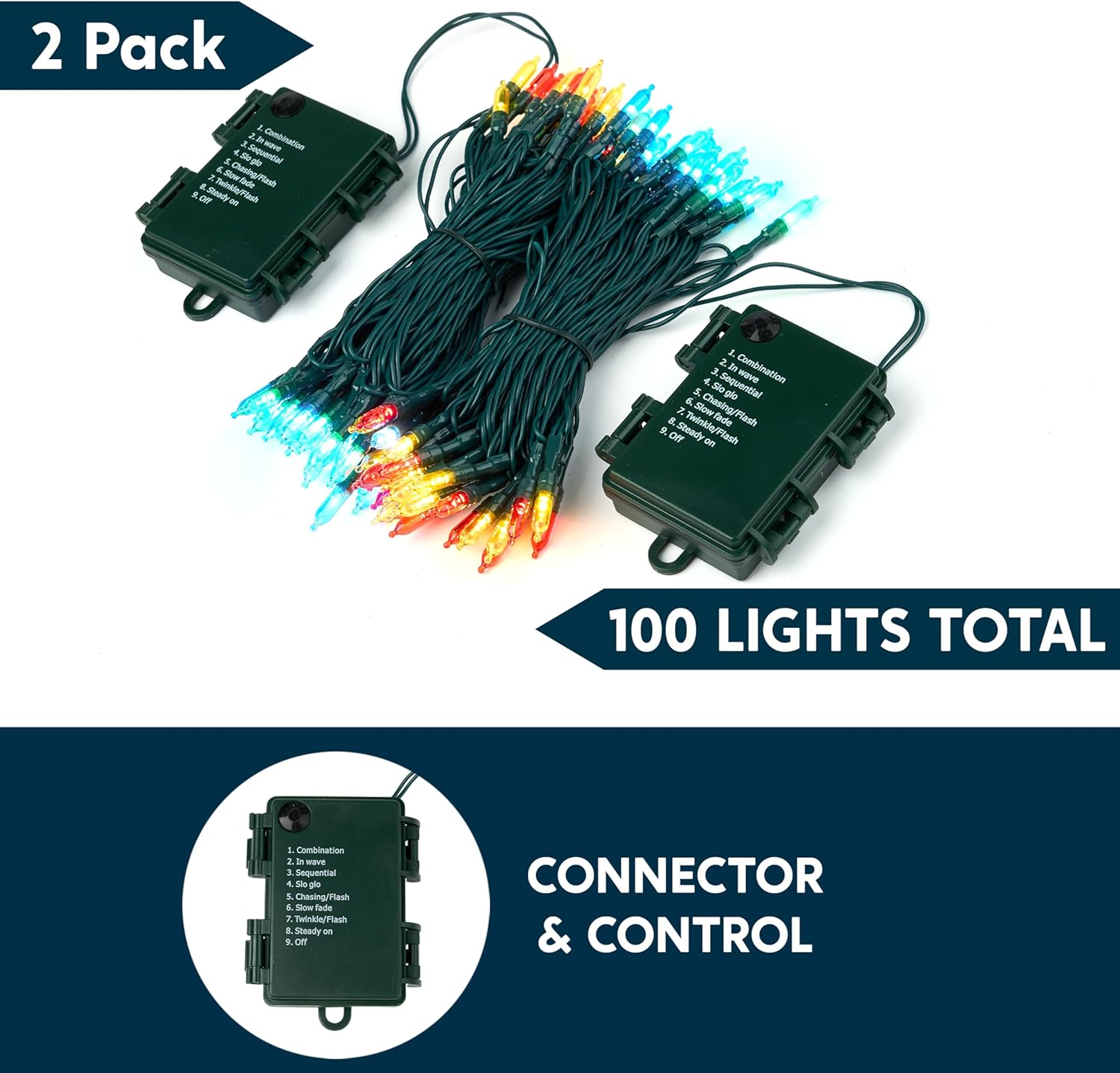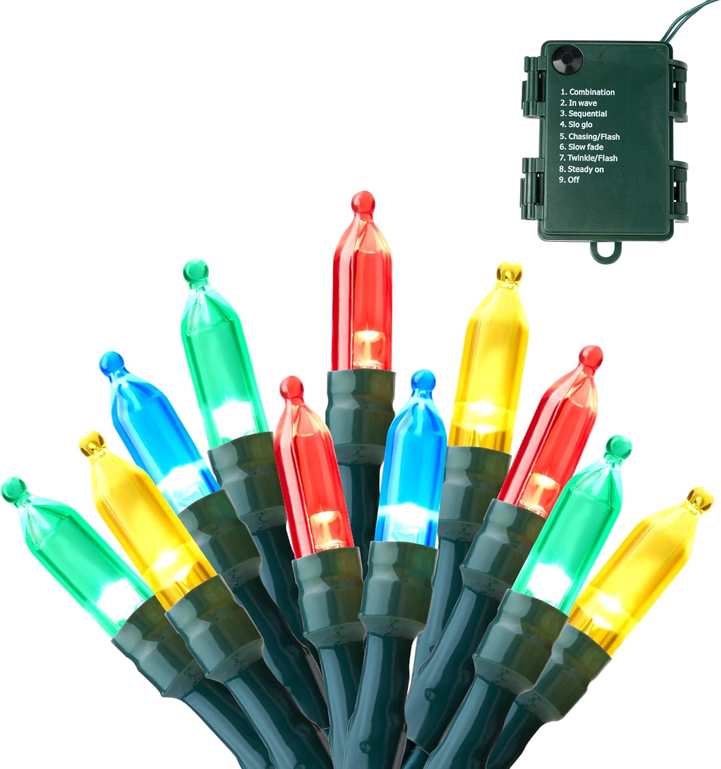- EASY TO OPERATE.The string lights could change the 8 lighting modes (Combination, In waves, Sequential, Slow Glow, Chasing/Flash, Slow fade, Twinkle/Flash, Steady on) by hitting the button in the battery box.