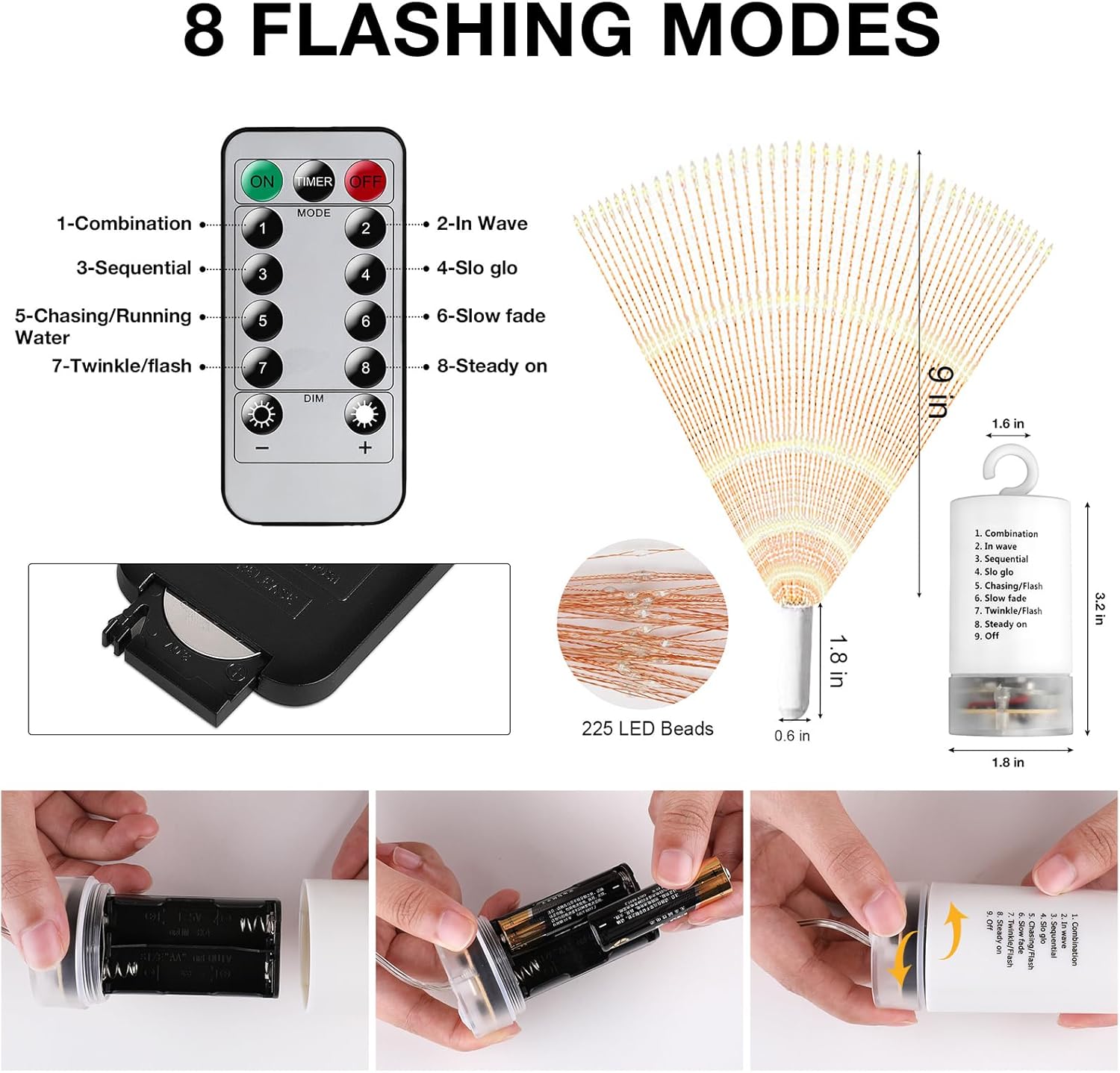 - 8 Modes Hanging Fairy String Lights with Remote: There are 4pack fairy lights with 4 remote,effective receiving range is 10-15 meter.Support range remote control to control 8 different modes (Combination, In wave, Sequential, Slo glo, Chasing/Flash, Slow fade, Twinkle/Flash, Steady on).To avoid forgetting to turn off the string lights, you can set timer by pressing the TIMER button, the timed fairy Lights can be set to automatically turn on for 6 hours and turn off for 18hours.
