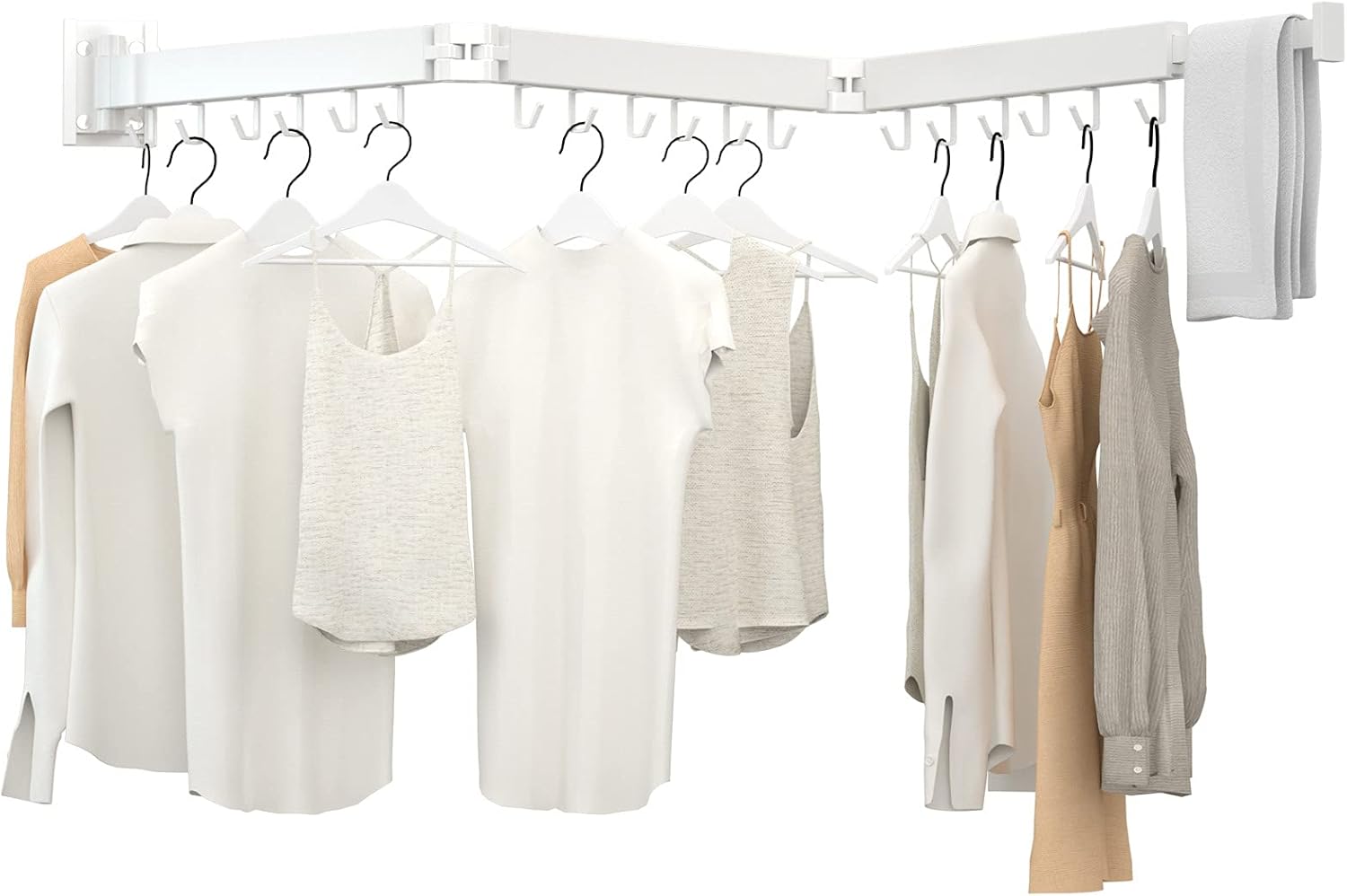 - ✅ Flexible & Space Saving Design -- This innovative clothes drying rack wall mounted can swing 180 ° to the left and right, allowing you to maximize your drying space. Also includes 12 hooks that can rotate 360° and a hidden telescopic rod. When not in use, simply fold down to a compact size to keep your area clutter-free