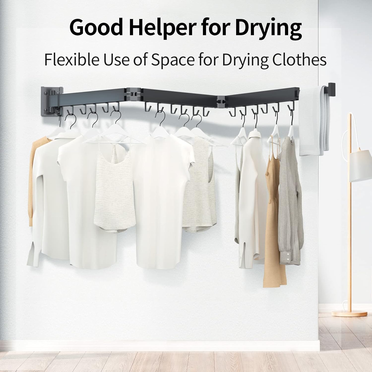 - ✅ Flexible & Space Saving Design -- This innovative clothes drying rack wall mounted can swing 180 ° to the left and right, allowing you to maximize your drying space. Also includes 12 hooks that can rotate 360° and a hidden telescopic rod. When not in use, simply fold down to a compact size to keep your area clutter-free